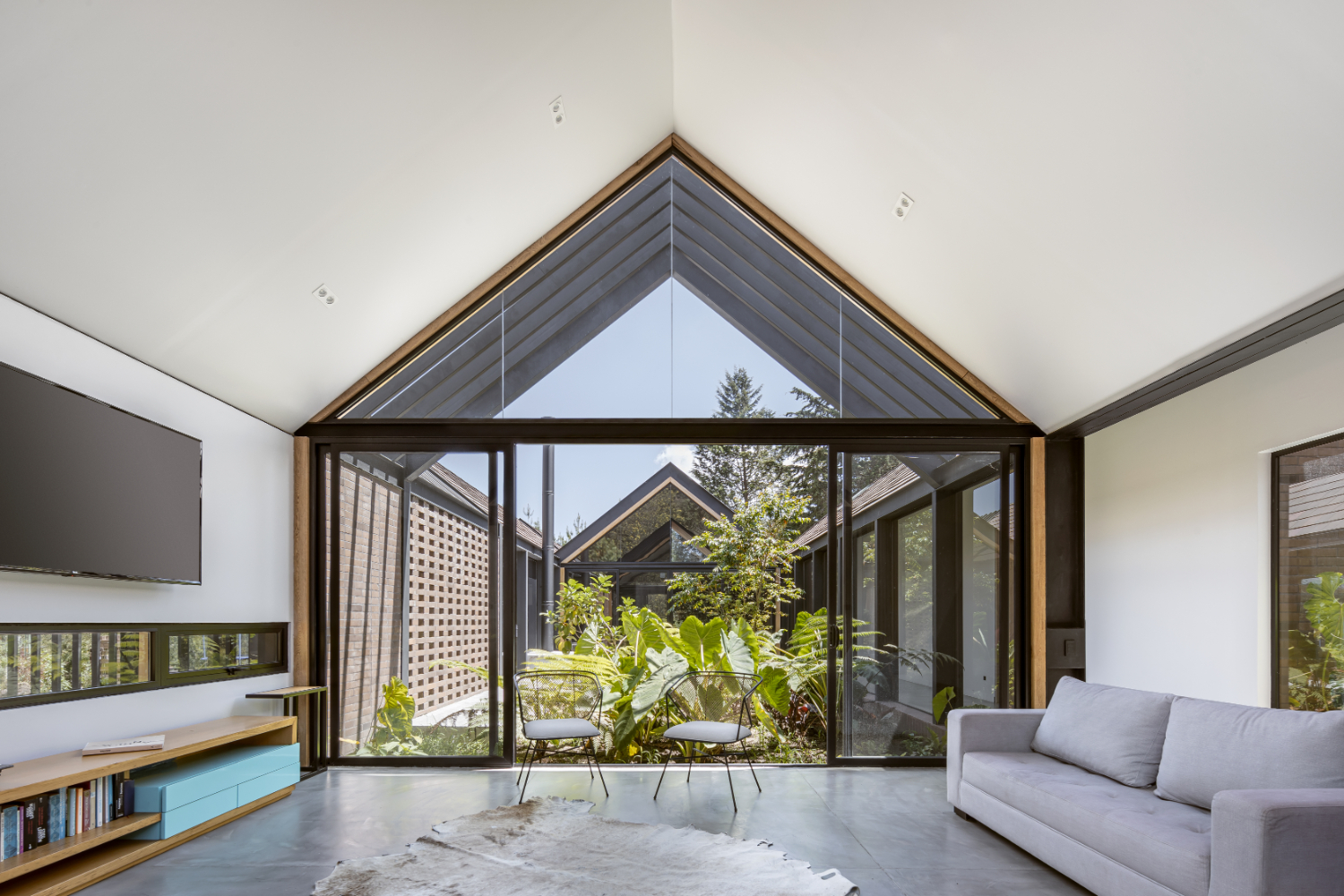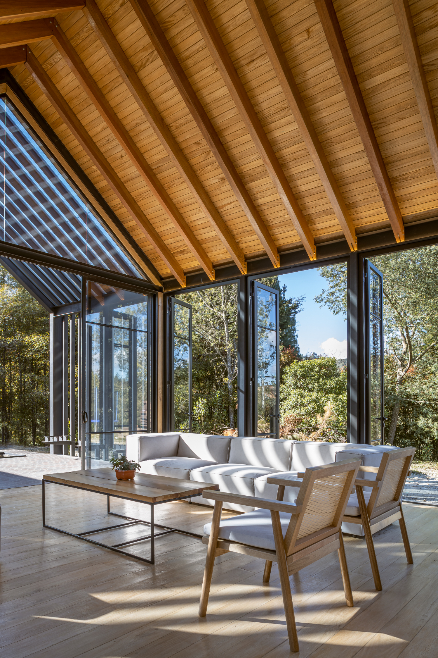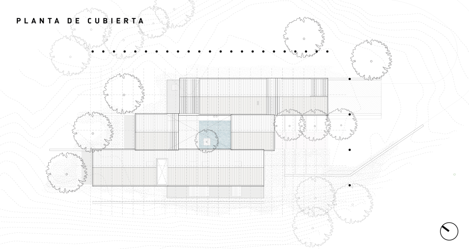 La estrategia arquitectónica surge de una sola sección extruida, que al desplazarse y vaciarse en puntos clave, permite estructurar el programa completo de la vivienda. Así se configuran tres naves longitudinales que se alinean con la pendiente natural del terreno: una para las áreas sociales y de servicio, otra para las habitaciones, y un volumen central que articula y conecta ambos extremos. Este pabellón intermedio funciona como un vacío activo, donde se ubican el vestíbulo, un patio interior y un estudio. Se trata de un espacio abierto, sin muros, delimitado por superficies acristaladas que disuelven los límites entre el interior y el paisaje circundante.