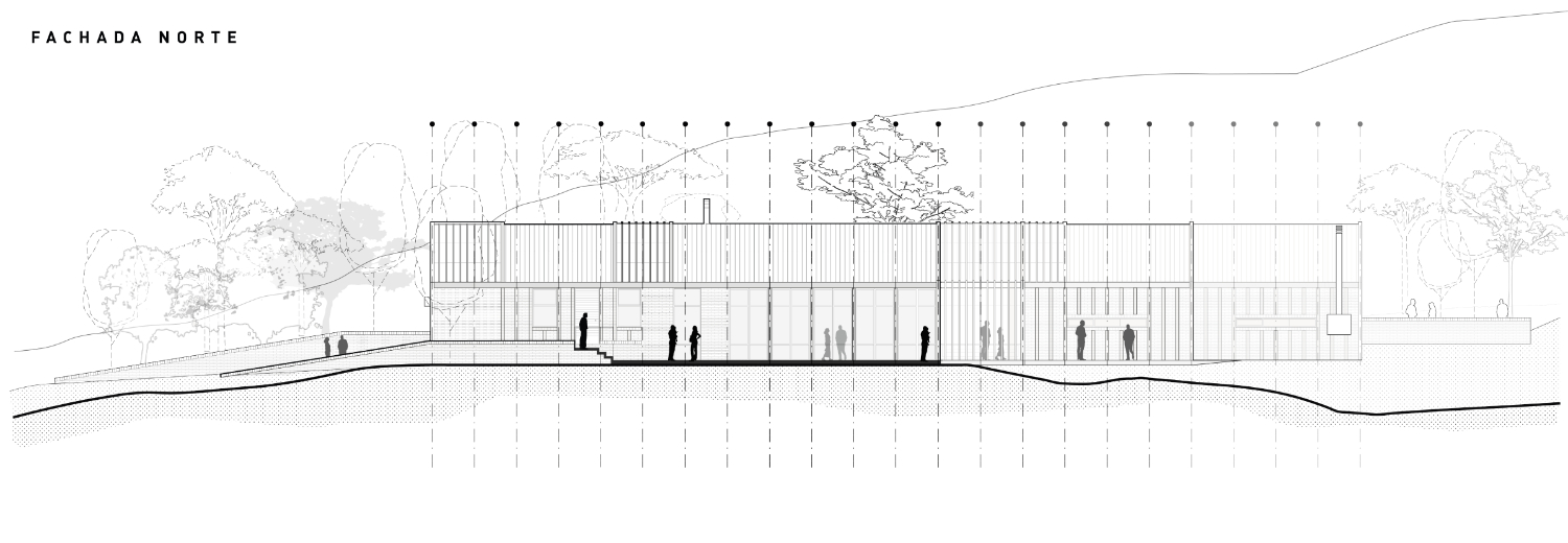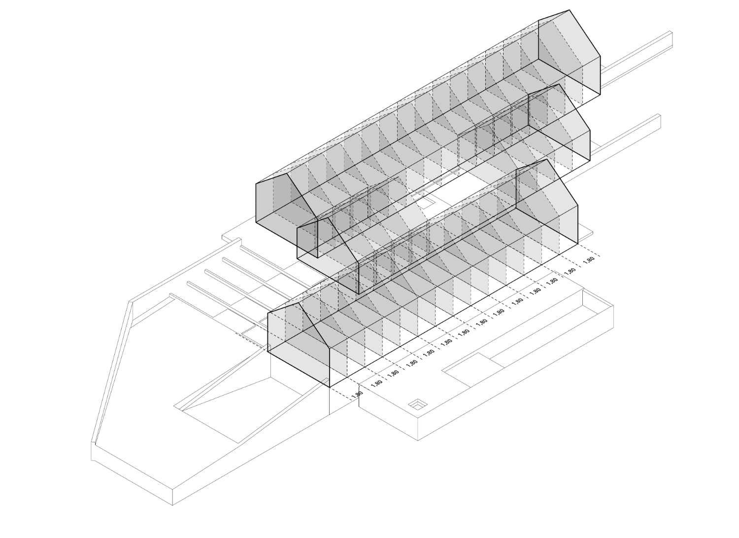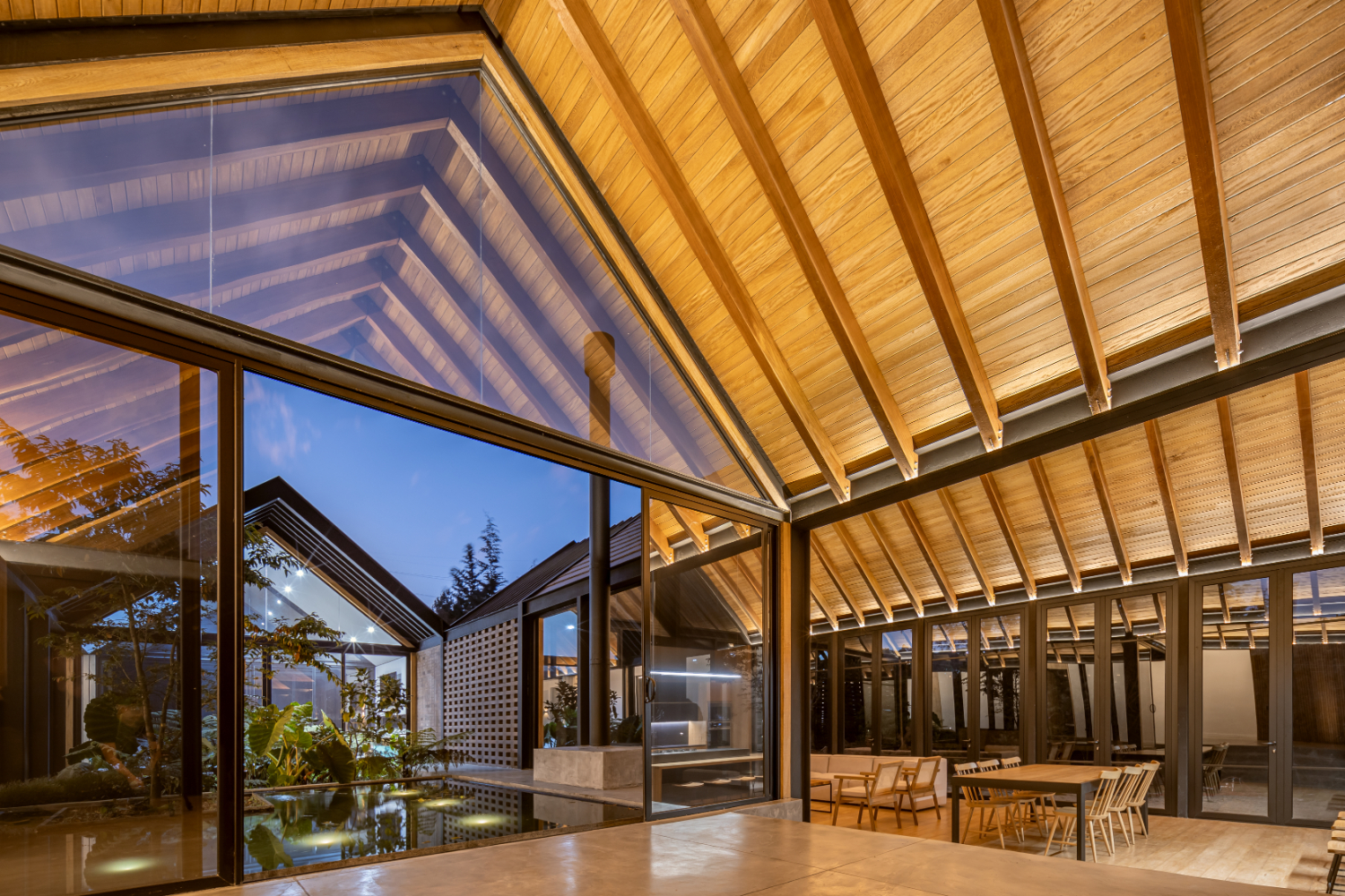 La estrategia arquitectónica surge de una sola sección extruida, que al desplazarse y vaciarse en puntos clave, permite estructurar el programa completo de la vivienda. Así se configuran tres naves longitudinales que se alinean con la pendiente natural del terreno: una para las áreas sociales y de servicio, otra para las habitaciones, y un volumen central que articula y conecta ambos extremos. Este pabellón intermedio funciona como un vacío activo, donde se ubican el vestíbulo, un patio interior y un estudio. Se trata de un espacio abierto, sin muros, delimitado por superficies acristaladas que disuelven los límites entre el interior y el paisaje circundante.