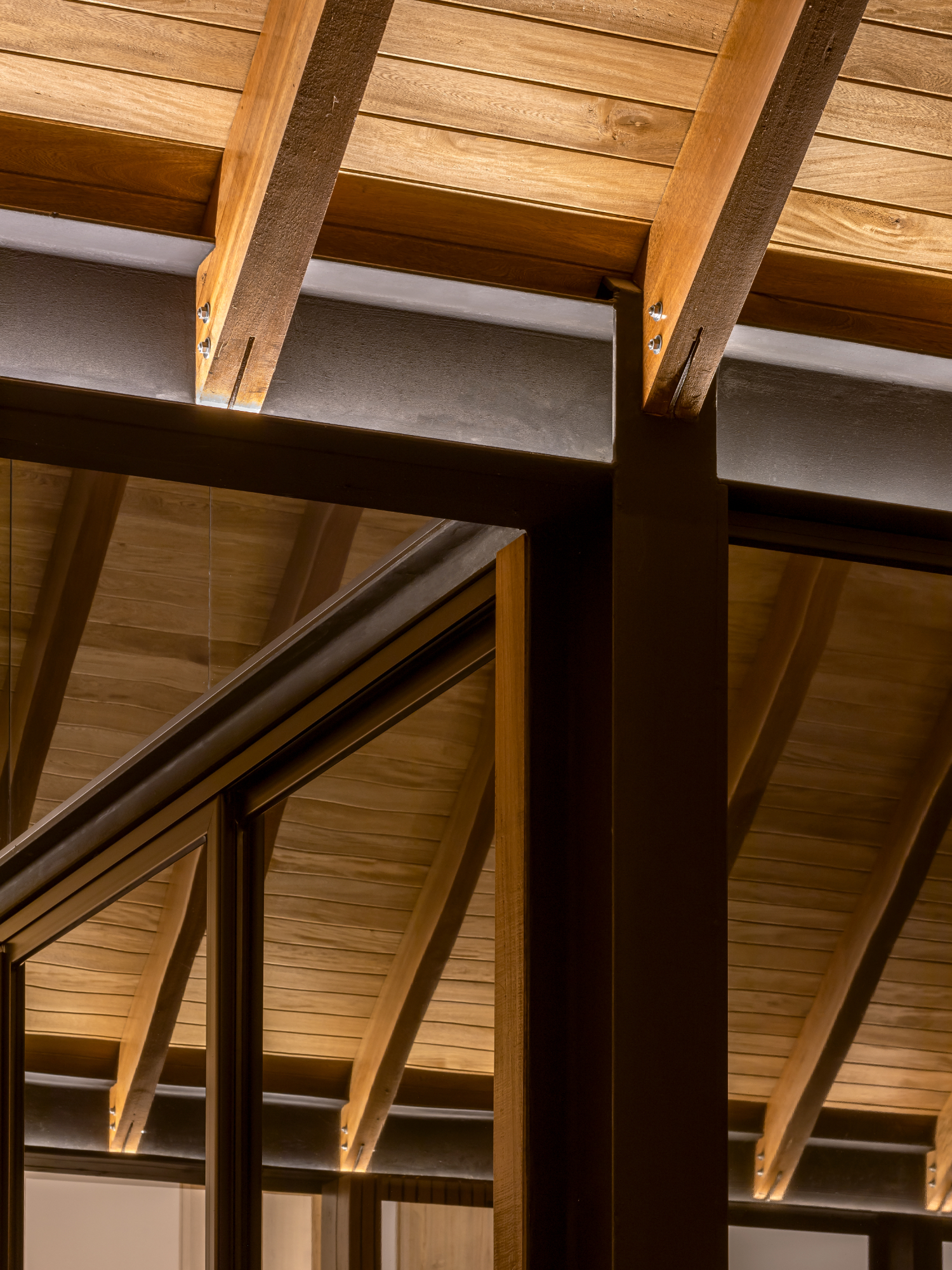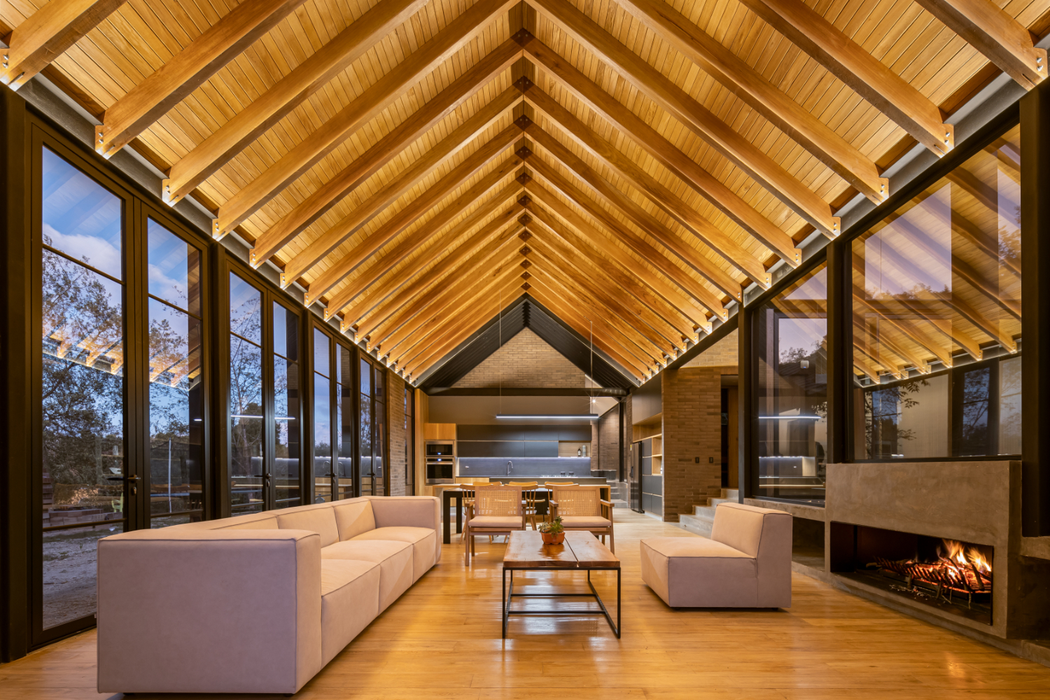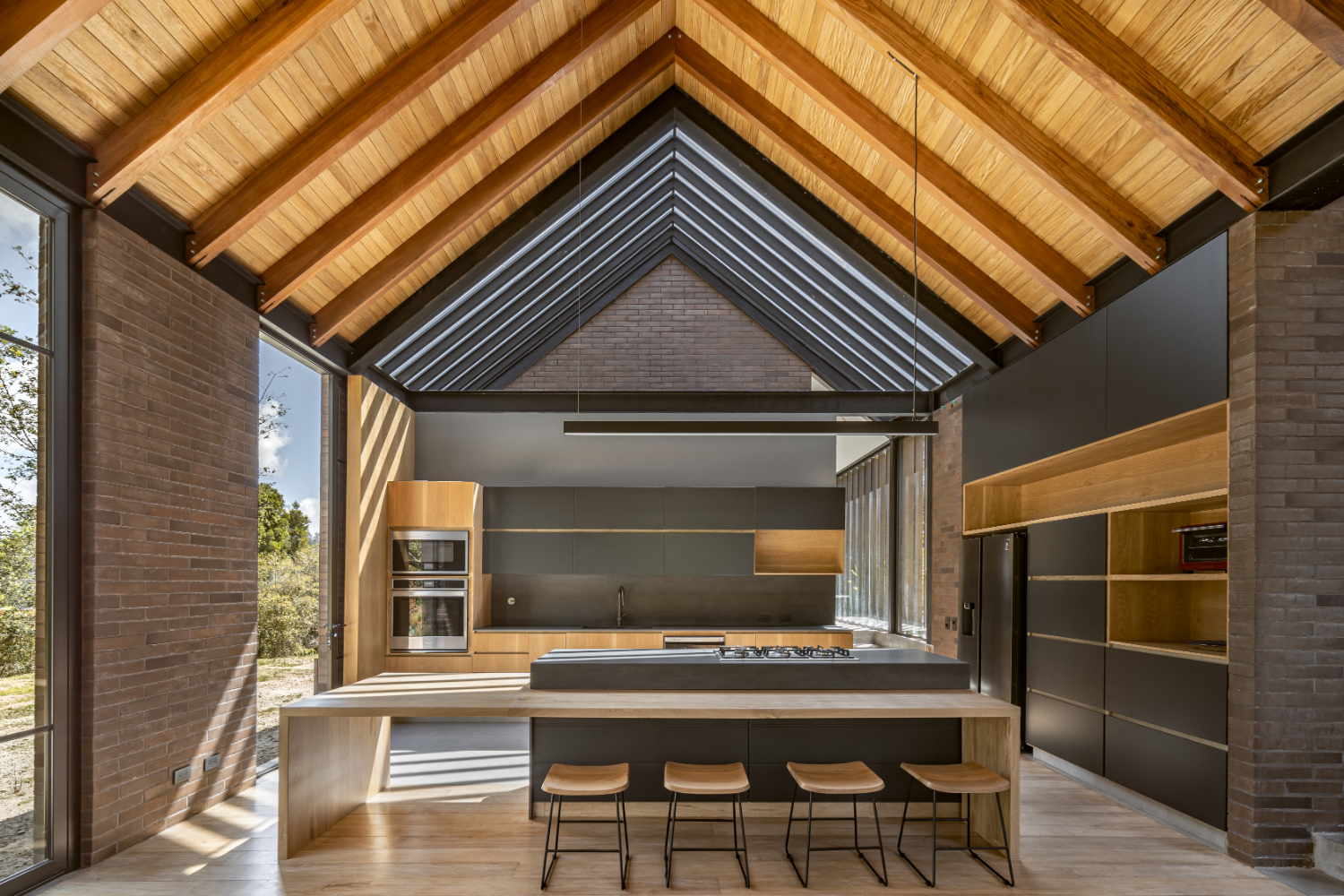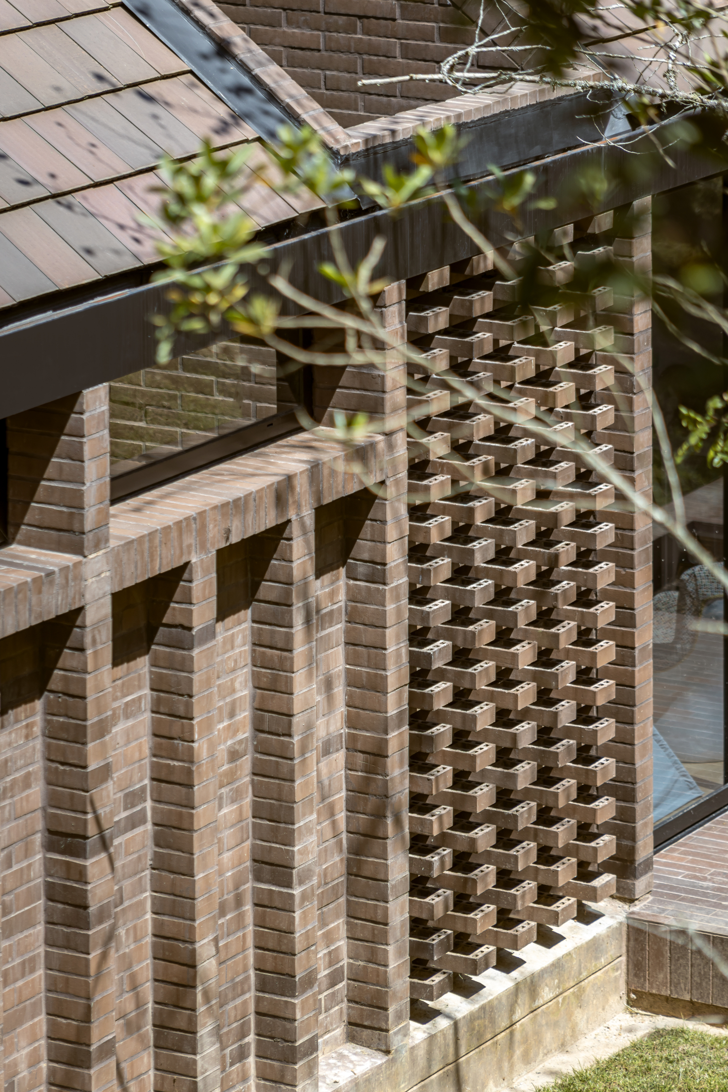 Desde lo constructivo, el proyecto se basa en una estricta modulación a partir de la medida del ladrillo. Esta decisión permite racionalizar los recursos, minimizar residuos y mantener una coherencia formal a lo largo de toda la vivienda. La materialidad se resuelve con una paleta sobria: ladrillo a la vista, madera, vidrio y metal, todos elegidos por su durabilidad y capacidad expresiva. Los muros de carga, de generoso espesor, incorporan entrantes, salientes y celosías que tamizan la luz, filtran el paisaje y enriquecen la experiencia espacial a través del juego de sombras.