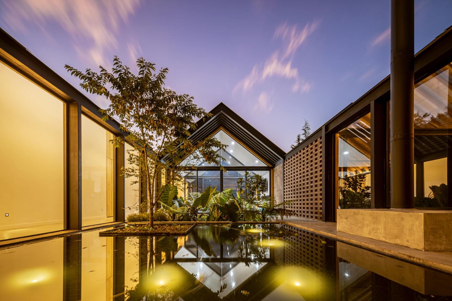 La casa retoma la lógica de la casa-patio tradicional antioqueña, integrando un jardín interior con vegetación nativa y plantas acuáticas que actúa como núcleo ambiental del proyecto. Este espacio organiza las relaciones visuales internas y mejora las condiciones de iluminación y ventilación natural. Mientras tanto, las zonas sociales se expanden hacia el exterior a través de terrazas cubiertas, y los dormitorios —más resguardados— se abren hacia el bosque, buscando intimidad y silencio.