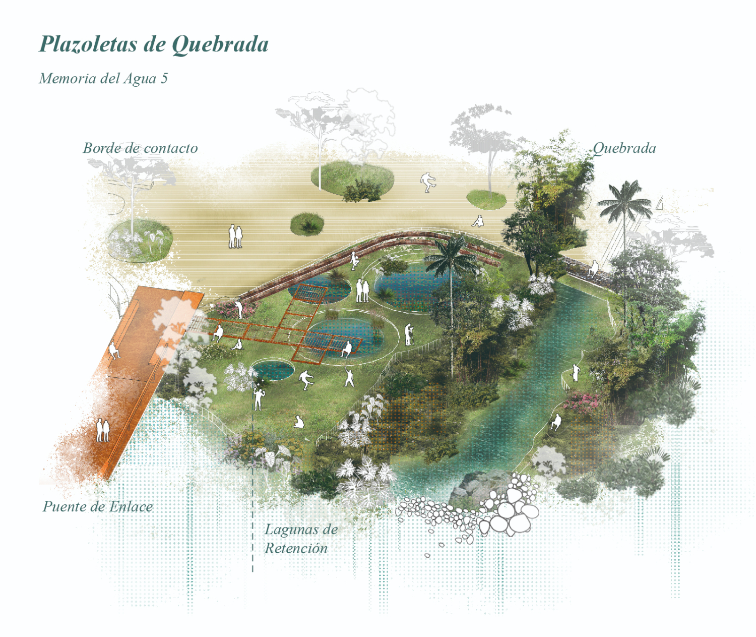 Escenarios contemplativos de como el agua va esculpiendo el territorio. Se reconocerán las dinámicas hídricas. Se configurarán espacios respetuosos con el medio ambiente para las dinámicas recreativas, deportivas y culturales de la comunidad, como también miradores que interactúen con el agua partir de la vista.